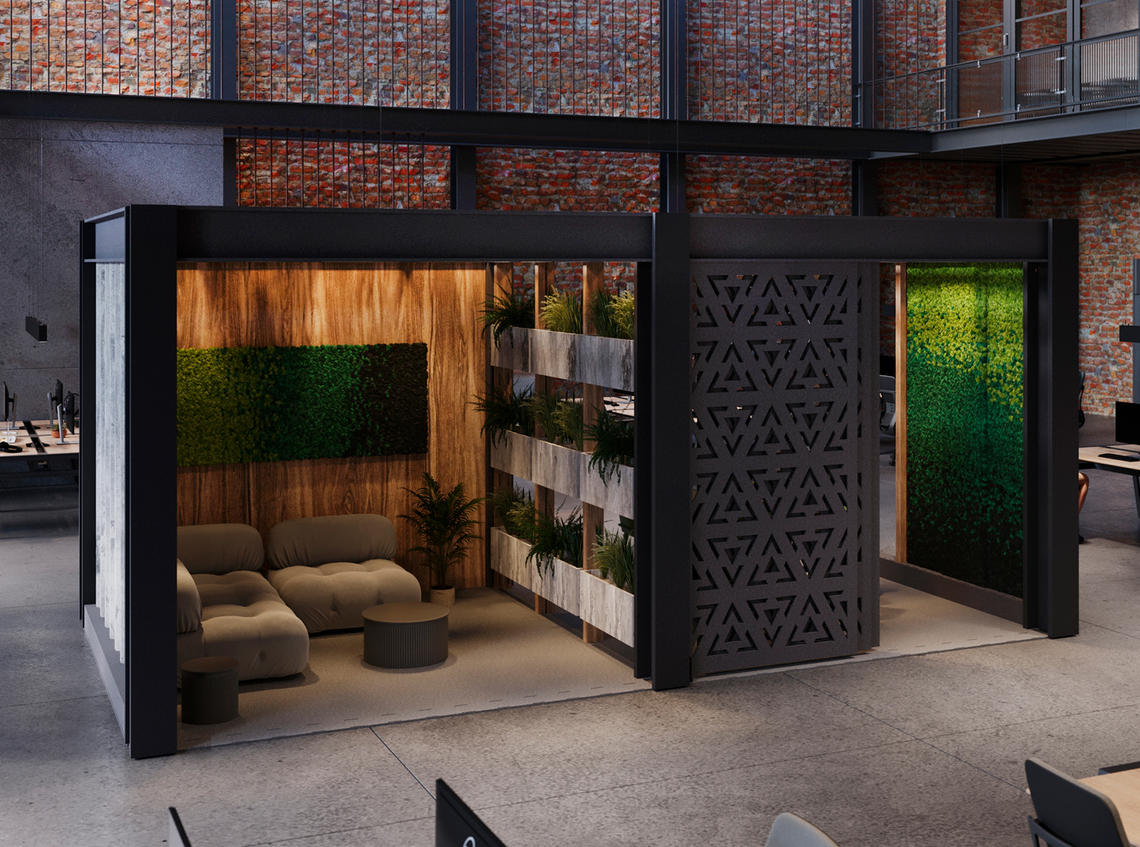 INtainer™ seamlessly integrates into various environments, including open-plan offices, institutional spaces, retail environments, and more. INtainer™ offers unparalleled versatility with EzoPrint finishing on both exterior and interior surfaces. Its open architecture design offers unlimited options for ceilings and walls as well as adaptable privacy levels. INtainer’s biophilic integration options include Quiet Earth Moss which adds a touch of nature to the industrial aesthetic, creating a perfect harmony of industry and greenery.