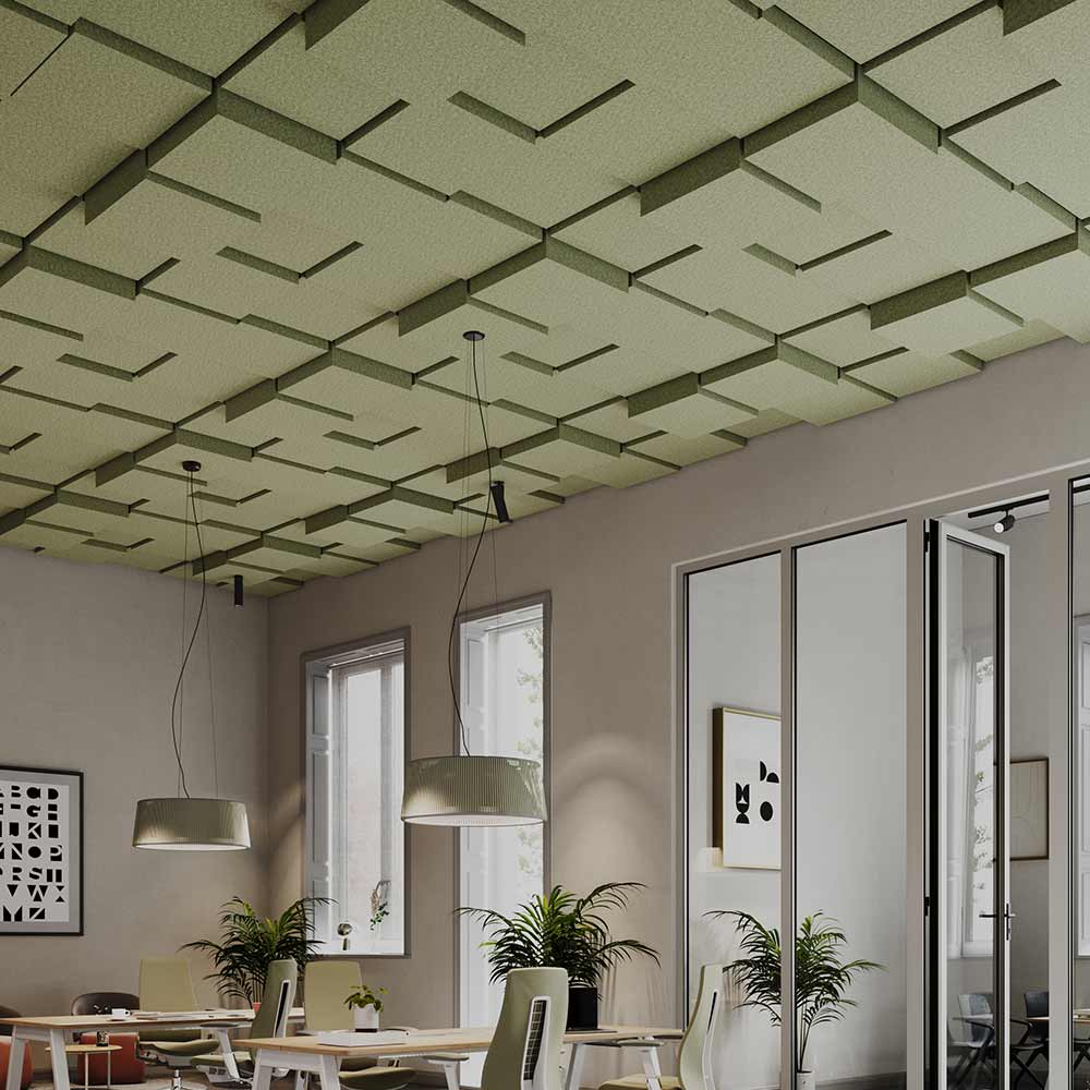 9mm EzoBord, 100% PET acoustic ceiling tile (min 50% recycled content)* with optional EzoLayer felt or EzoPrint finishes.